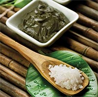 Pour 200 g d'algues préparées, ajoutez 100 g de sel de mer, 3 c. huile d'avocat et 1 capsule de vitamine E liquide. Bien mélanger jusqu'à consistance lisse et appliquée sur le corps, en frottant doucement en mouvements circulaires. Garnir d'un film et d'une couverture. Après 20-30 minutes, ou après avoir senti un léger picotement, laver le contenu de la peau. Cette procédure est également un bon peeling.