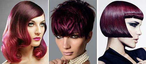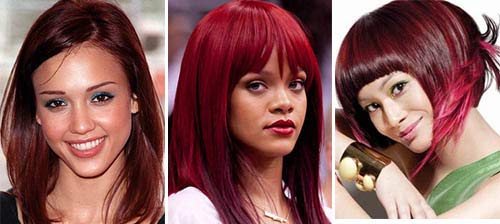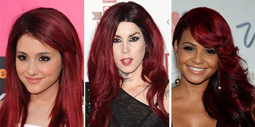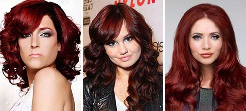Rouge foncé est une couleur calme, qui est souvent choisie par les femmes aux cheveux bruns - il n'est pas très différent de leurs cheveux précédents. Cependant, il va aussi aux brunes - en particulier ceux avec les yeux bruns et la peau tannée ou basanée. Il y a quelque chose à choisir: la "famille" des tons rouges foncés est très grande. Vous pouvez commencer à compter avec cerise et finir avec des tons violets.