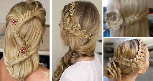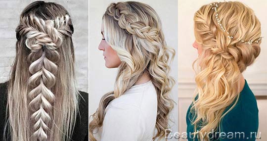 Les tresses peuvent être posées dans différentes conceptions de noeud ou enroulées autour d'une couronne autour de la tête. Au lieu de rubans, utilisez des perles luxueuses. Dans la saison à venir, les plus pertinents seront les "épillets", les "paquets français" et les "tresses villageoises" habituelles.
