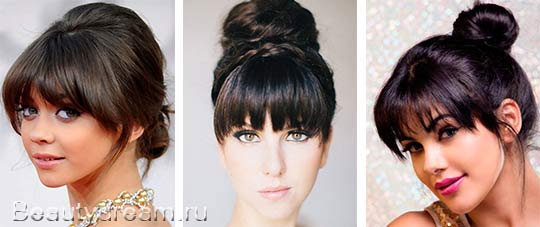 Avec une longue frange luxuriante, les hautes coiffures du soir sont très impressionnantes. Même si vous avez décidé de simplement recueillir les cheveux dans la queue, une frange luxuriante rendra le style de cheveux élégant.