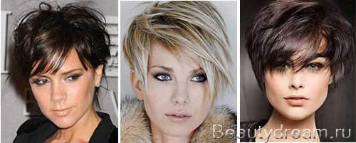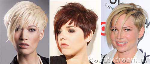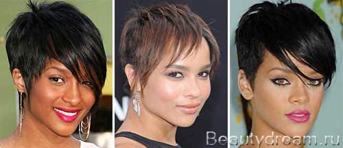 Pixie-haricot, faite pour une courte longueur, plus frange oblique - c'est la variante la plus commune des coupes de cheveux. Les cheveux les plus courts rappellent un peu la coupe de cheveux d'un homme - mais si la forme de votre visage est arrondie, correcte, la coiffure ne fera que souligner votre féminité.