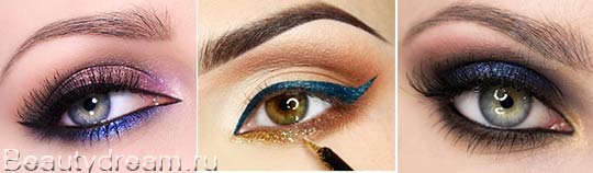 Les flèches de couleur, paillettes, seront appropriées le jour de l'an non seulement pour les jeunes filles, mais aussi à l'âge de Balzac. La couleur du tireur est sélectionnée sous le ton de la robe, entourez le contour des yeux avec un eye-liner noir et des cils densément colorés - et l'image est prête.