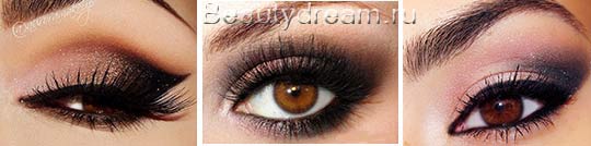 Nous commençons de la même manière avec la base, sous l'ombre vous pouvez appliquer une crème hydratante, pour que les ombres durent plus longtemps. Nous appliquons des ombres des tons clairs aux tons foncés ou vice versa, et nous ombrons bien. Ensuite, utilisez podvodkoj ou un crayon, la principale chose à peindre sur toute la partie supérieure de la croissance des cils, différemment un maquillage sera impoli.