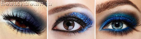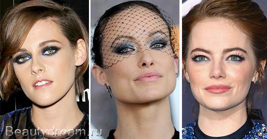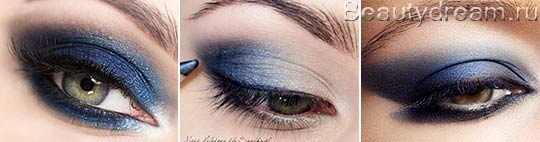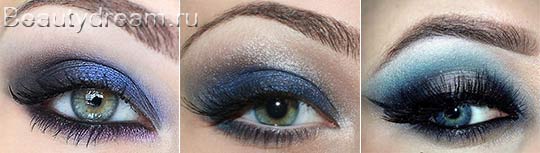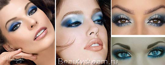 Pour l'image du soir, les ombres bleues peuvent être complétées avec un eye-liner noir, ainsi que des flèches noires actives sur la nuance bleue des paupières. Cependant, le mascara noir doit être appliqué exclusivement sur la paupière supérieure, laissant la paupière inférieure plus détendue. Dans le choix du fard à joues devrait adhérer à la règle de sélection par la couleur et l'ombre de la peau. Les nuances de bleu peuvent être complétées non seulement avec le fard à joues de cuivre, mais également avec les nuances roses et brunes roses. Rouge à lèvres peut être complètement exclu de l'image, en le remplaçant par un lustre brillant incolore.