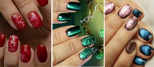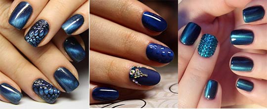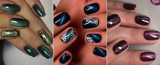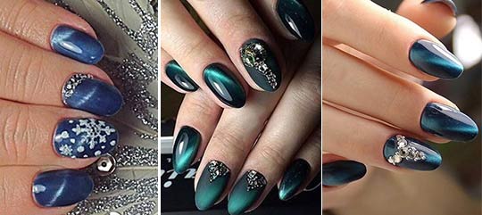 L'oeil de chat de conception d'ongle regarde le volume et très élégant, ainsi il conviendra à n'importe quelle soirée de gala. Créer c'est très simple. Dans un gel-laque spéciale contient des microparticules de métal, qui, sous l'influence d'un aimant spécial eux-mêmes forment sur les motifs de l'ongle 3-d. Aujourd'hui, le vernis magnétique peut créer non seulement une ligne verticale. Manucure "Cat's Eye" peut ressembler à des étoiles, des vagues, des diagonales. Pour créer un tel effet, il n'est pas nécessaire d'acheter plusieurs vernis, seuls des aimants supplémentaires sont nécessaires, qui sont vendus séparément.