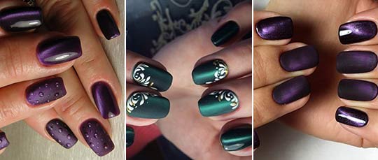 Une autre option de mode est la combinaison de la laque magnétique brillante avec mat. Faire un ou deux ongles avec un gel-vernis mat de la même teinte pour obtenir un contraste tendance pour aujourd'hui. Sur les ongles mates, vous pouvez placer des accents brillants avec des strass.