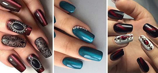 Les vernis magnétiques sont produits dans une palette de couleurs riches, de sorte que chaque fashionista choisira une nuance pour tout le monde avec son goût. Chaque nuance sous l'influence de la lumière joue différemment, mais les motifs les plus beaux et saturés se manifestent avec des vernis bleu foncé, vert et marron.