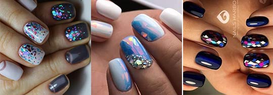 5. Préparer des morceaux de film holographique, de mica, de papier d'aluminium ou de cellophane, en imitant le verre brisé, étaler une fine couche sur une feuille de papier blanc. Donc, ce sera plus pratique de travailler. Prenez un crayon cosmétique ou un cure-dent simple et arrangez soigneusement les morceaux de mica, à partir du centre de l'ongle. Sur les côtés de l'ongle doit être collé de plus petites pièces. Lorsque le motif est prêt, séchez le résultat obtenu sous la lampe jusqu'à ce que la laque durcisse.