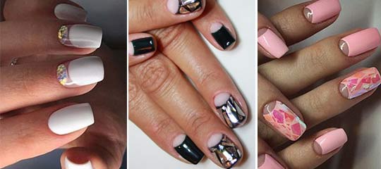 Une des variétés populaires de verre cassé manucure est devenu un design transparent. Sur un ongle, poser un voile transparent et lui imposer des figures de verre légères ou transparentes. Une telle manucure a l'air plus tendre, donc elle conviendra au mariage et au bureau.