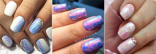 L'effet du verre cassé sur les ongles est créé par des morceaux de mica ou de feuille spéciale, qui sont joliment disposés sur un gel-vernis bas. En conséquence, une manucure ressemble à une surface de diamant ou un motif dans un kaléidoscope. Le jeu de la lumière rend les ongles accrocheurs, perceptibles et incroyablement élégants. Un autre avantage de cette conception est son unicité.