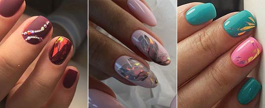 Les ongles auront l'air intéressants si vous les recouvrez d'un gel-vernis monochrome, et sur le dessus, mettez une variété de feuilles ou de cellophane.