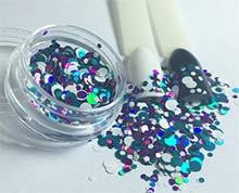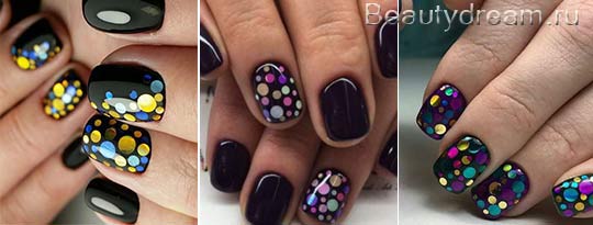 Disco. Tous les confettis sont sélectionnés dans un type et une taille. Avec leur aide crée l'apparition d'une boule disco sur l'ongle. Le plus réussi n'est pas la couleur argentée, mais la couleur émeraude.