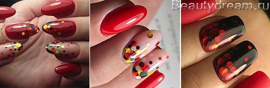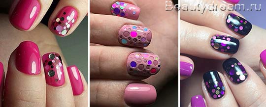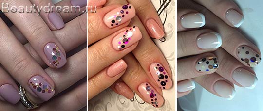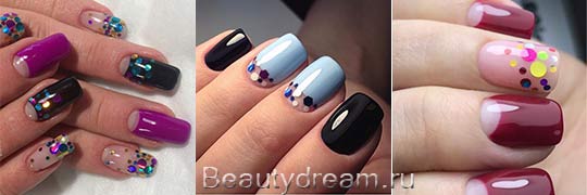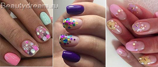 L'ensemble habituel de bijoux pour manucure, en règle générale, se compose de kamifubuki 3 couleurs et tailles. Dis, rond, aussi bien que sous la forme d'un coeur, astérisques et ainsi de suite. Ces ensembles vous aideront à faire la manucure festive et quotidienne avec kamifubukami dans n'importe quel style (un videur, bascule, femme d'affaires, princesse romantique, et ainsi de suite). Vous avez seulement besoin de choisir la bonne échelle et joindre des confettis.