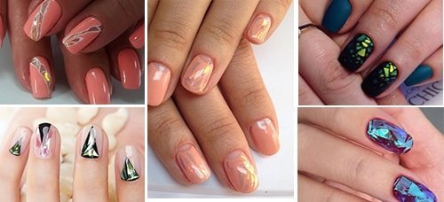 "Verre brisé", ou la soi-disant manucure en verre - une saison d'ouverture à la mode. Pour obtenir cet effet, achetez une feuille spéciale ou une cellophane holographique, coupez-les avec des angles vifs, puis appliquez sur les soucis (ou juste un, ou à son extrémité).