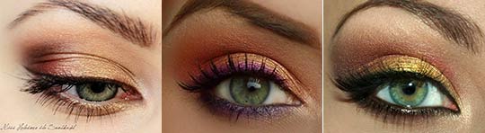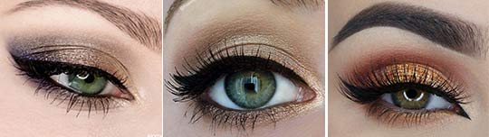 Des nuances dorées fraîches donneront aux yeux verts une lueur incroyable, un soleil brillant. Un tel maquillage sera gagnant-gagnant à n'importe quelle partie.